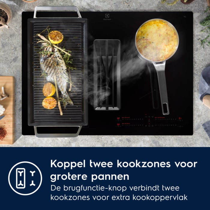 Geniet van de vele voordelen van een inductiekookplaat die past in een kast van 60 cm met een ingebouwde dampkap voor een optimale luchtstroom. De 600 Bridge kookplaat met afzuiging heeft ook een brugfunctie, waardoor je 2 kookzones combineert tot één groter gebied.
