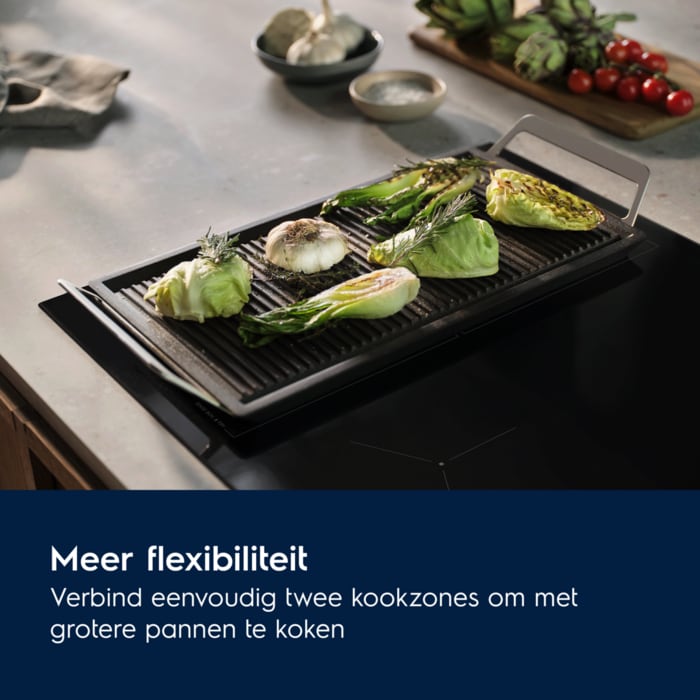 De 600 Bridge-inductiekookplaat laat je twee afzonderlijke kookzones samenvoegen om één groot oppervlak te creëren. Met de temperatuur- en tijdsinstellingen die automatisch worden afgestemd, is dit ideaal voor grillplaten of stoofpannen.